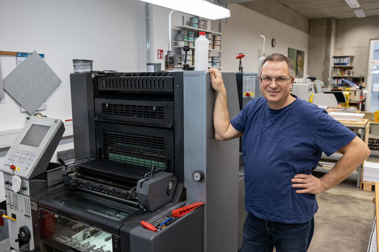 Andrej Grünberg ist ein sehr erfahrener Drucker. Er merkt schnell, wenn etwas anders läuft als geplant. Und zwar meistens mit seinen Ohren. „Ich kenne jedes Geräusch der Maschine, und wenn da etwas nicht passt, höre ich das“, sagt er. Sein Gehör und sein Wissen sind für die BTS von großer Bedeutung. Nicht nur, weil die kleine Druckerei so die von Kunden gewünschten Erzeugnisse produzieren und vertreiben kann. Sondern auch, weil es Andrej Grünberg möglich ist, parallel eine weitere Aufgabe zu erfüllen: Als Beschäftigungsassistent leitet er Menschen mit psychischen Beeinträchtigungen im laufenden Druckbetrieb zu möglichen Tätigkeiten an.
