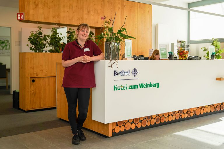 Nathalie Hoppe besuchte eine Förderschule und arbeitete in einer Werkstatt für behinderte Menschen (WfbM). Obwohl sie dort zu den leistungsstärksten Mitarbeitenden zählte, war es fraglich, ob sie jemals eine sozialversicherungspflichtige Tätigkeit ausüben würde. Ein Zustand, der an ihrem Selbstbewusstsein nagte. Nathalie Hoppe unternahm mehrere Anläufe; doch auf eine Stelle, die nach ihrem Empfinden gut zu ihr passte, stieß sie zunächst nicht. „Es hat schon eine Weile gedauert, bis ich den richtigen Weg gefunden habe“, erzählt sie. Fündig wurde sie auf einem betriebsintegrierten Arbeitsplatz der WfbM im Bethel-Hotel zum Weinberg.