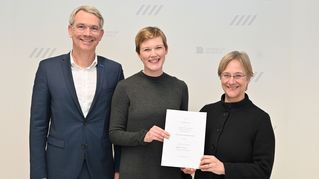 - Bildunterzeile: Uni-Rektorin Prof. Dr. Angelika Epple übergibt die Ernennungsurkunde an Prof.in Dr. Carolin Steuwe, die von EvKB-Geschäftsführer Dr. Matthias Ernst begleitet wird. (v.r.n.l.).