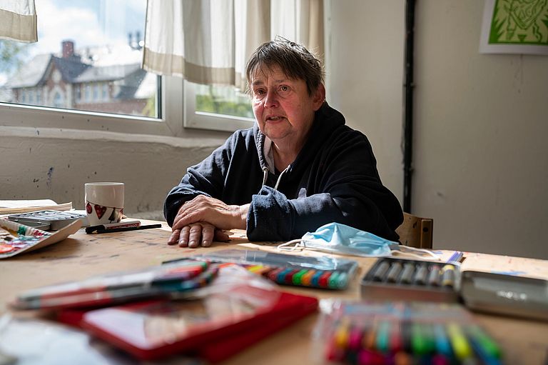 She is receiving special support for a whole year. Art therapist Nele Zeis is her assistant. When Susanne Hadamitzky comes to the studio after working in a Bethel workshop for people with disabilities, she has all the colours, all the materials and all the attention just for herself for an afternoon. "It's great!" says the artist, who loves bright colours. She hurries across the room and heads for a shelf with bulbous plastic bottles. Shake, and then a thick blob of colour lands on a paper plate. Yellow. Orange. Deep green and pink. "Done!" Susanne Hadamitzky nods contentedly and dashes back with her improvised colour palette.
