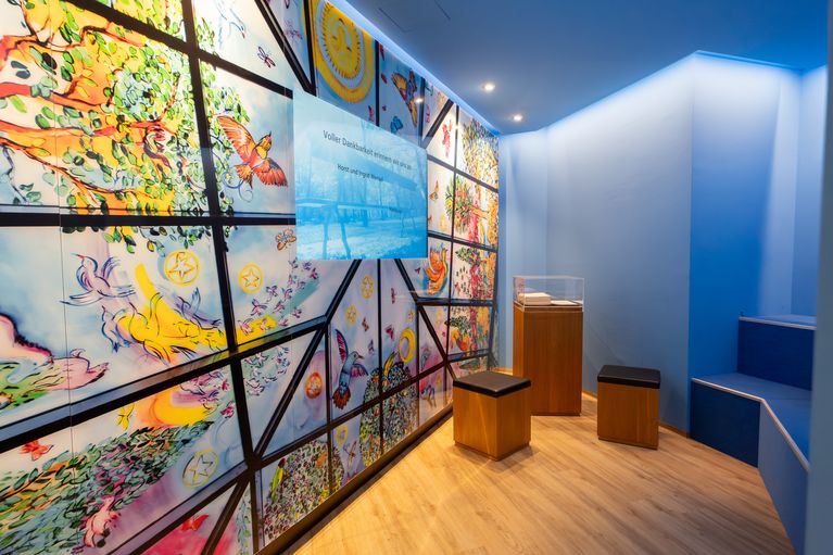 Den Freunden und Förderern Bethels möchten wir danken und Menschen wie sie nicht vergessen. Deshalb haben wir einen besonderen Ort geschaffen, an dem wir ihrer gedenken - über den Tod hinaus. Dieser Ort der Erinnerung befindet sich ganz bewusst mitten im Leben. Im Foyer des Hauses "Dankort", unserer zentralen Öffentlichkeitsarbeit, in dem sich täglich Menschen begegnen, haben wir einen spirituellen Bereich geschaffen. Eingebettet in Himmelsmotive auf gläsernem Hintergrund werden Namen und biografische Daten verstorbener Förderer auf einem Bildschirm sichtbar. Eine Kirchenbank und weitere Sitzgelegenheiten laden ein zum Innehalten. Der Blick wird auf ein Erinnerungsbuch gelenkt, in dem die Namen und Todestag der treuen Freunde und Förderer Bethels aufgeführt werden.